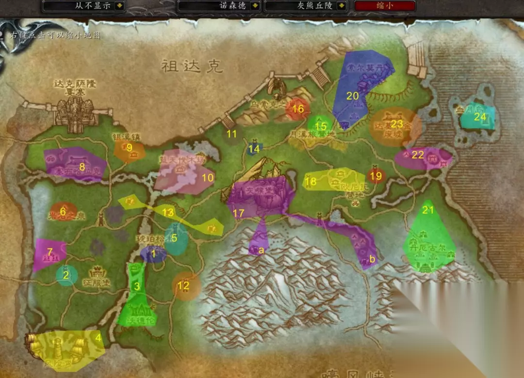 起始地区域1琥珀松木营地,从1接了任务去2的途中顺道打够鹿肉和狼。 回1以后接了后续去3之前清理掉营地瀑布下的PVP任务,第二次去3的时候可以去下面做掉4的PVP任务。 接到外交活动任务时,先去区域6做达库鲁任务线,在8接到蓝天伐木场任务以后去10, 可以顺道做掉10的PVP日常任务,然后去9做完逃离银溪镇任务回到1 营地接到乌索克任务线第一步区域13做完回1交接后续,去11做尽在掌控,14接护送完成到达15。 16完成以后触发阿鲁高任务线,去17做盲眼卢娜,收集完蛾子粉尘的后续幻象里面,可以右键点掉幻象BUFF快速完成任务出幻象。 如果做乌索克任务线,则在17和a,b两个山洞完成以后回1交,接后续再回7,最后在16上方击杀乌索克,完成最终任务乌索克,巨熊之神 完成18任务后,在19买冰风月光酒,回15交,接任务后开始做区域20任务。 区域20在外面一直做到奥尔隆德的命运和符文中的预言,然后去山顶做找到库伦!,一直做到攻破防线,在坑道完成这三个任务。 直接去21或者先去22接任务,压制符文任务做完右下角的监工再去21皆可。 按照顺序做22的后续,最后去24完成狼人的末日。 这就是《魔兽世界怀旧服》wlk灰熊丘陵任务怎么做的详细内容了,玩家可以根据攻略多多尝试,找到适合自己的解决方法来完成通关。