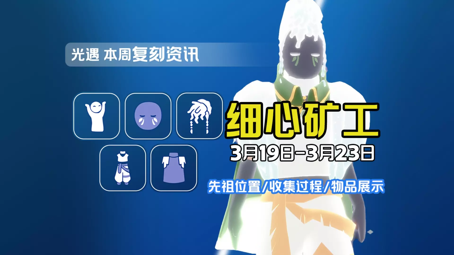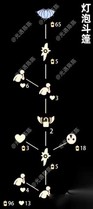光遇4.7复刻攻略 一、灯泡斗篷先祖复刻兑换表 1、灯泡斗篷,65白蜡烛。 2、倒三角面具,18根白蜡烛。 3、嘘声动作,升级需要13颗爱心。 4、这个先祖的兑换价格比较便宜,兑换总计需要96白蜡烛,2红蜡烛,8颗爱心。