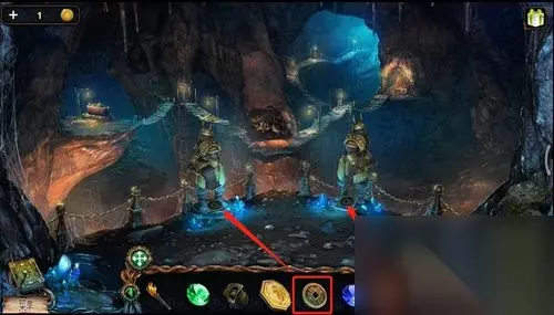 拿到两个铜币后,回到两个矮人雕像那里,将两个铜币放上去。