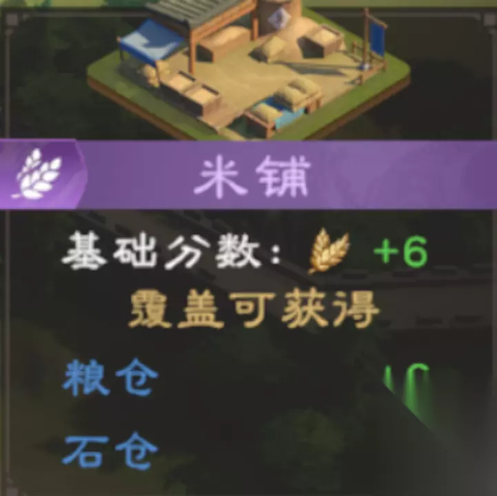 其加分规则为: 覆盖相关的二级建筑则进行加分,每一个三级建筑均有一个主覆盖+6分,副覆盖+3分。 如米铺,覆盖粮仓+6分,石仓+3分。