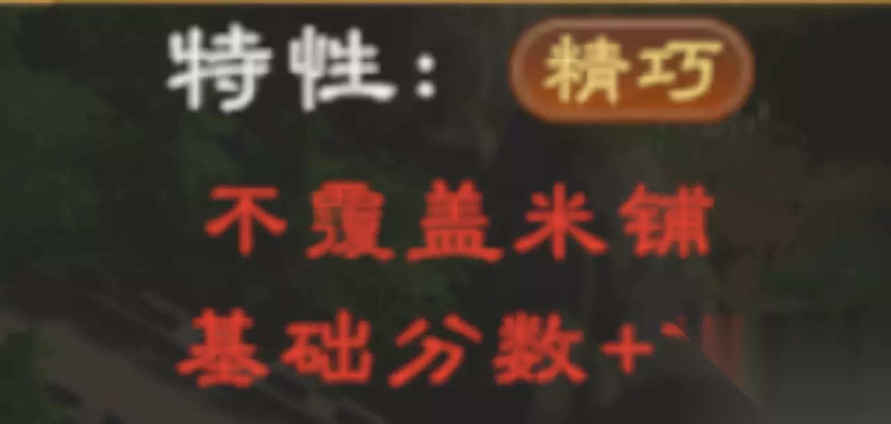 特性:精巧 独特特性,周围没有同类建筑时+15分。但是,其要求不可集群布置同类建筑,要求较高。