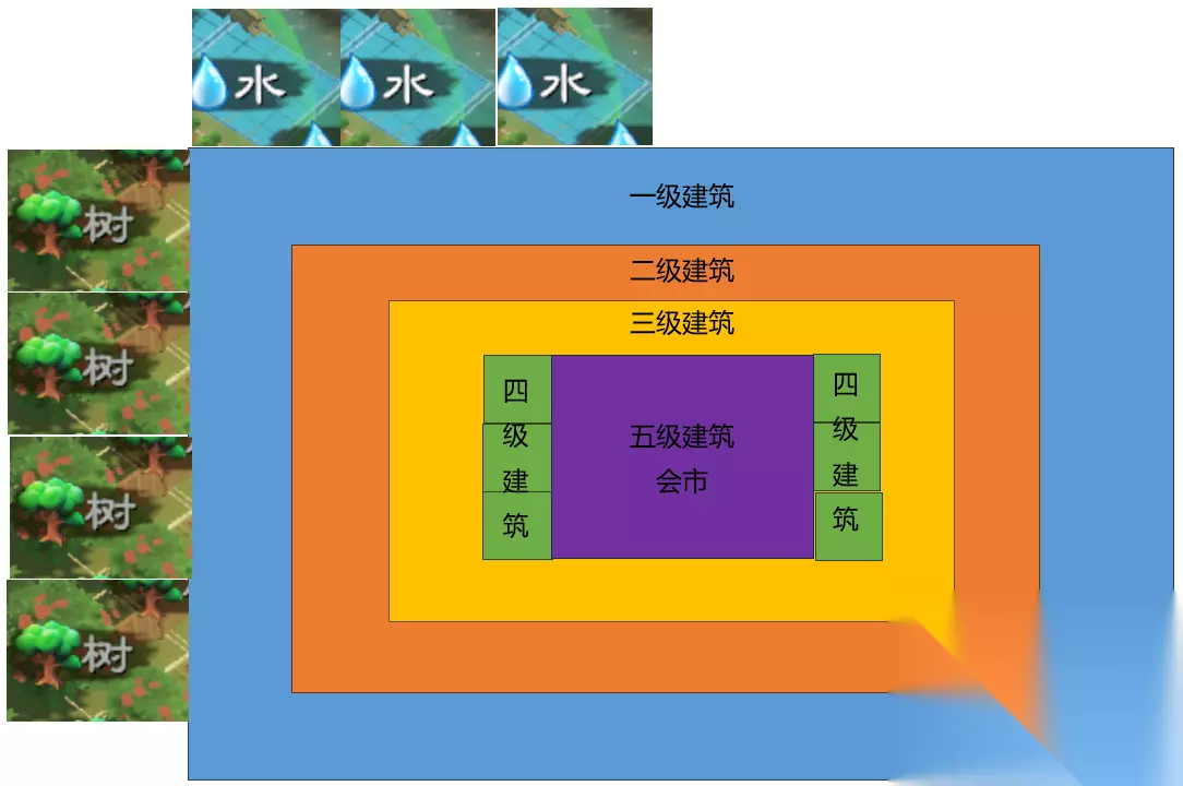 建筑通用摆放思路 从上面的建筑类型和建筑特性分析,我们可以得到以下摆放思路(颜色对应不同的建筑类型): 一级建筑:摆在最外围贴近相关自然资源 二级建筑:贴近一级建筑摆在内圈 三级建筑:贴近二级建筑摆在更内圈 四级建筑:错落布置,避开覆盖同类的四级建筑,贴近二三级建筑 五级建筑:布置在四级建筑中心,给四级建筑加分