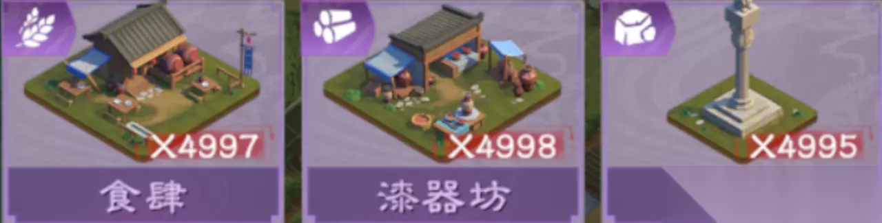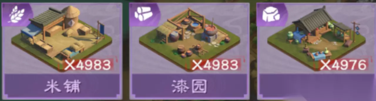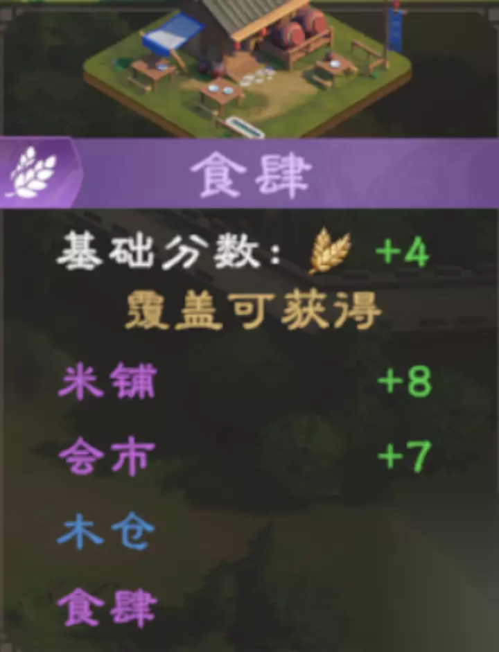 除开民仓,其他规则为: 覆盖对应的1级建筑则加+5分,例如粮仓每覆盖1块田庄+5分。 民坊则为每覆盖1个其他3种仓库则+2分。 三级建筑:加工类 以下为3个为3级加工建筑。