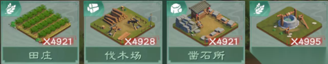 主公们好!阿武携民生攻略又与您见面啦。在前篇民生系统简要攻略的基础上,本篇攻略将会给主公们带来进阶的民生玩法! 阿武会具体介绍每块封地的布局思路以及建筑分级,本思路并非最优,仅为较优思路,仅供主公们参考。 民生通用布局思路讲解 一通则百通,阿武先讲述通用的布局思路,后续再根据通用布局思路,进行详细分解布局。 建筑类型解析 首先,建筑分为以下大类: 一级建筑:资源类 以下为4个为1级资源类建筑,其中井栏分数较低,并不建议使用。