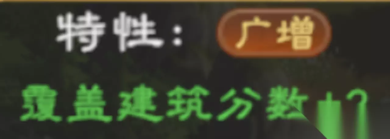 特性:广增 强力通用特性,覆盖的建筑分数直接+2,适用于附近有大量加分建筑时。