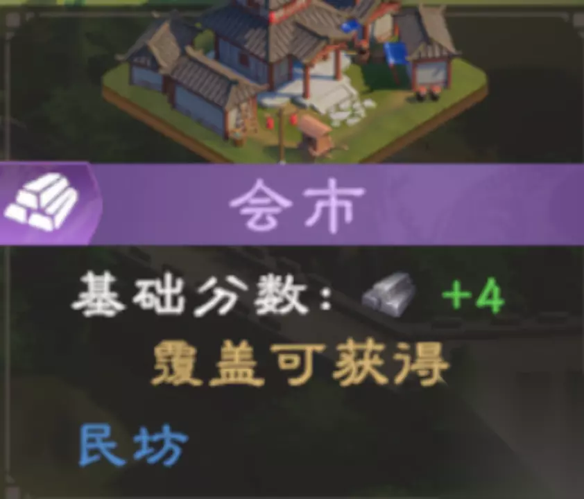 五级建筑:会市 五级建筑为会市,所有四级建筑覆盖它时将会加分,同时,其覆盖民坊时,也会加分。