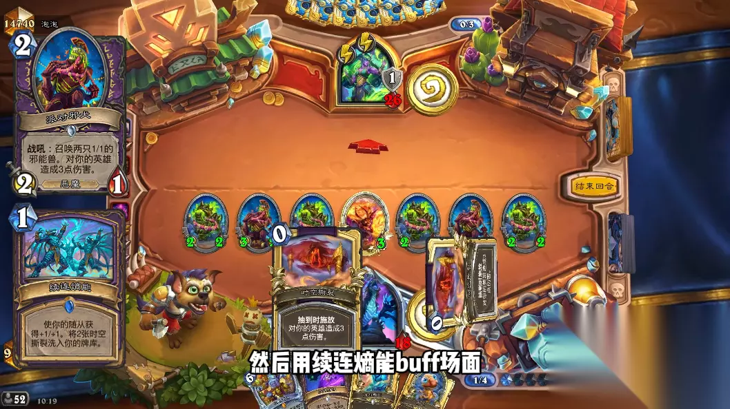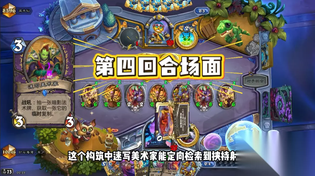 要是面对解场弱一些的职业,恶兆邪火+挟持射线这波压制力很强。这个构筑中速写美术家能定向检索到挟持射线。下面这个是我第四回合的场面,强不强!
