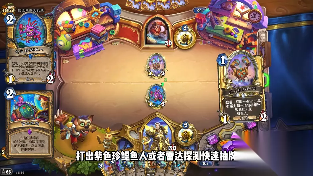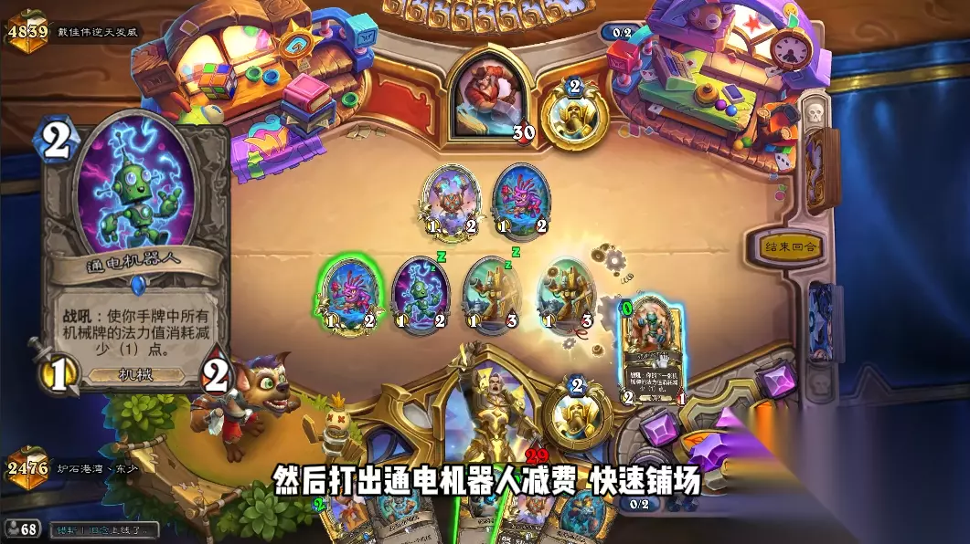 打出紫色珍鳃鱼人或者雷达探测快速抽牌,然后打出通电机器人减费,快速铺场。buff手段有空中飞爪、光速抢购和十字军的光环等,直接速推对手获胜,我一般都是第五回合左右就赢了。