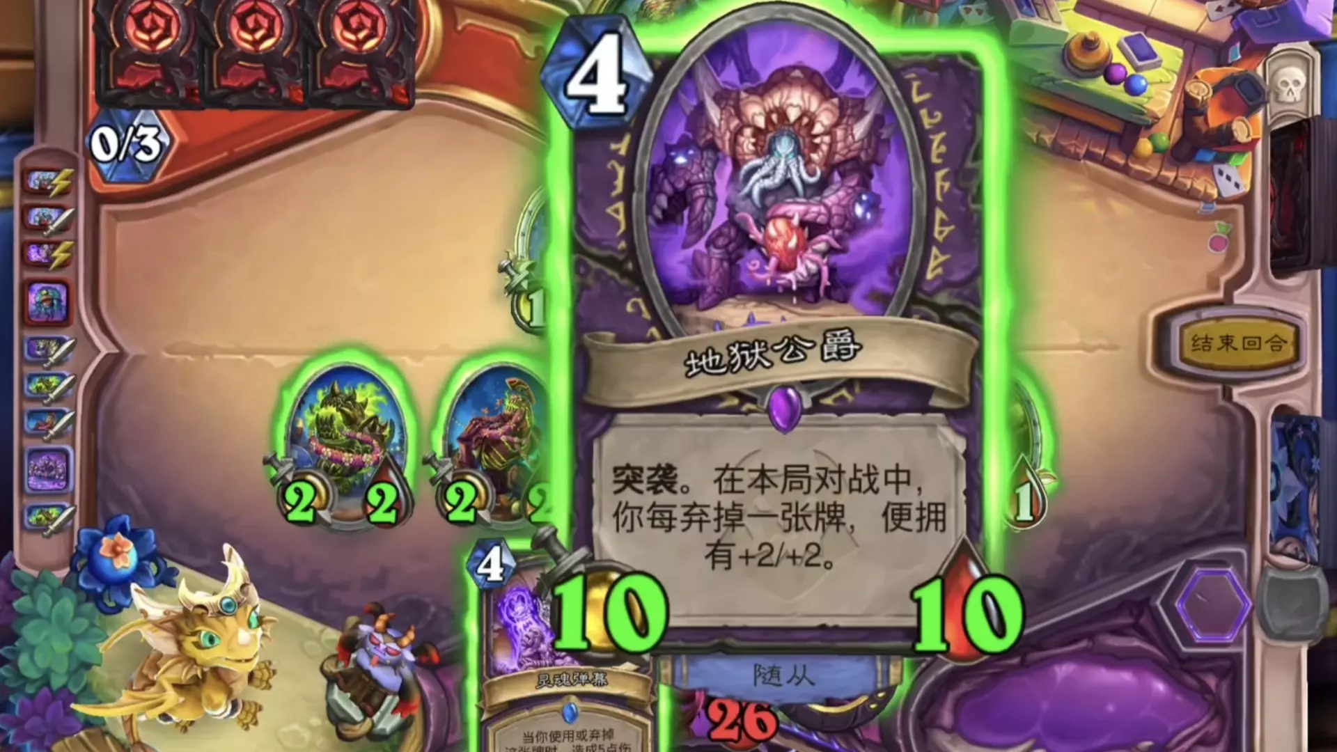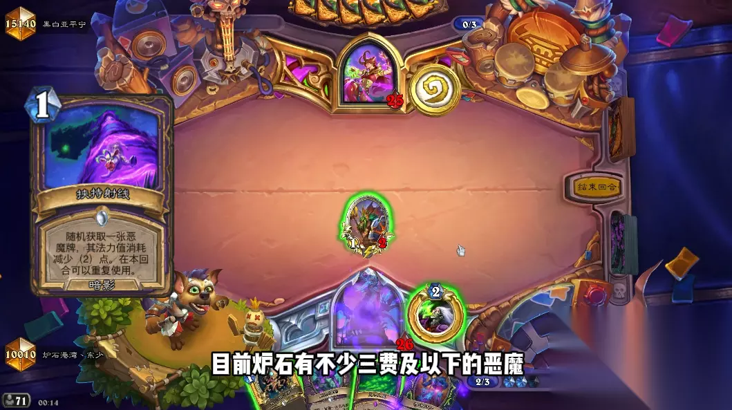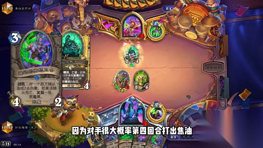 目前炉石有不少三费及以下的恶魔,我这里获得了和精魂商贩、躁动的愤怒卫士、凶魔城堡,其中凶魔城堡可以直接打出站场。我留着躁动的愤怒卫士,因为对手很大概率第四回合打出焦油。