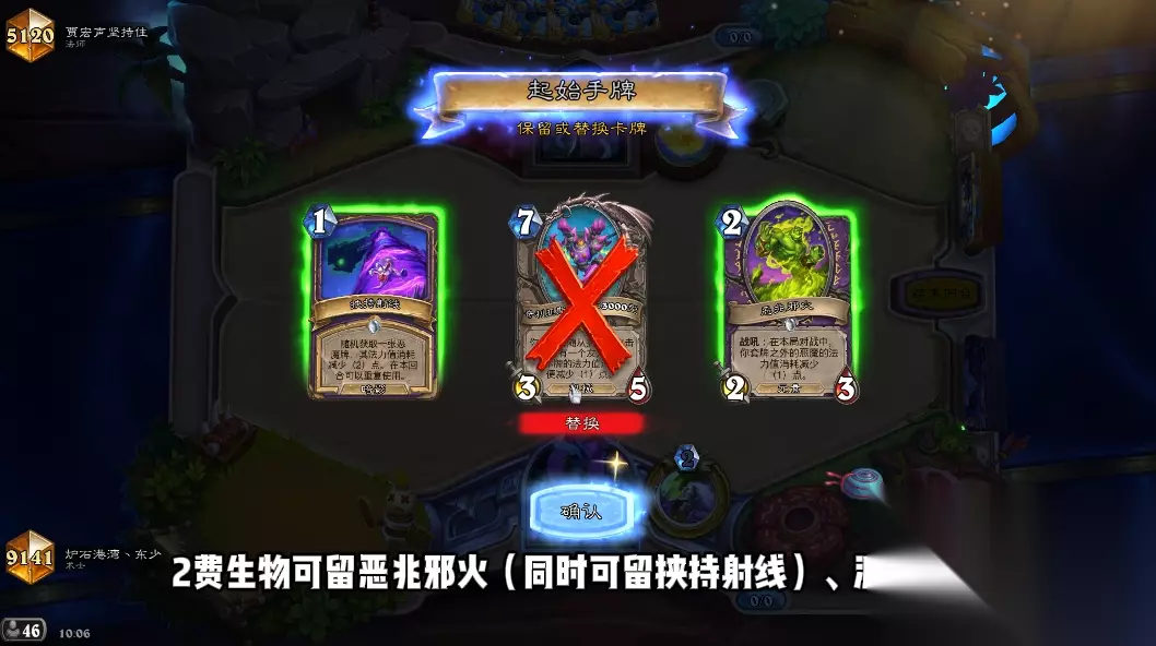 一般可留有质量的一费随从,比如烈焰小鬼、凶恶的滑矛纳迦。2费生物可留恶兆邪火、派对邪犬,讲故事的始祖龟要看其余手牌情况决定,一般后手留的概率更大。