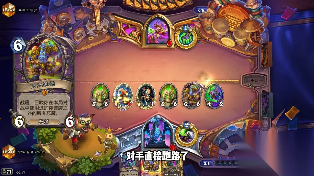 不过好在愤怒卫士竟然选到了阿克蒙德,对手继续打出焦油来护脸。我打出5费的阿克蒙德,对手直接跑路了!