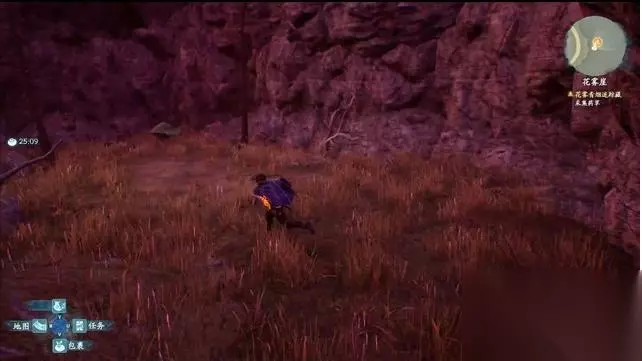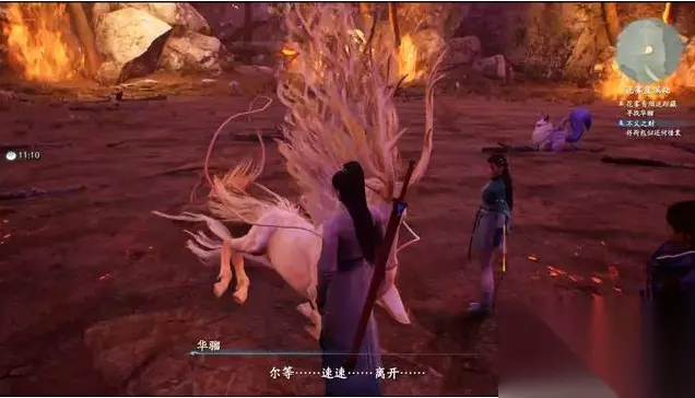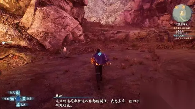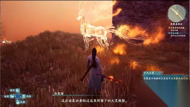 捡草药时遭遇上方落石,好在修吾及时相救,有惊无险。 继续前进,进入花雾崖寻找华骝的踪迹。 场景中出现的残影,会指向华骝的方向,也可根据听到的叫声判断。