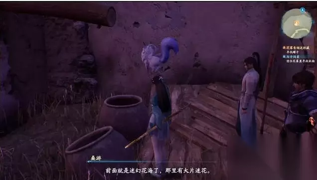 进入青烟村后,首先来到桑游旧居,找到房子旁边的几个捣药罐。 花雾崖的迷花能够产生毒素,使人乏力,桑游表示应先在附近采集一种抵御花毒的药草。