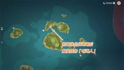t15_2-t15_1:10.0 标签: 听海 、 海螺 原神听海人任务怎么完成?原神听海人任务已经开启,这任务需要获得双双岛的指定回声海螺才能触发,而触发以后可以找到一个宝箱,那么具体的宝箱密码是什么呢?下面就带来了具体的任务攻略,希望大家喜欢。 原神世界任务听海人完成攻略 世界任务:听海人 任务触发地点:在双双岛拾取指定回声海螺即可触发世界任务「听海人」,海螺具体位置如下图所示,可以从双双岛传送点直接飞过去。
