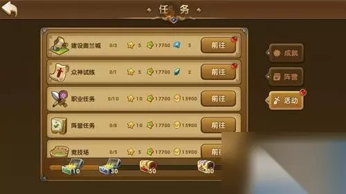 六、【任务系统】 《永恒之歌》的任务系统可以说是游戏的一大特色,除了主线任务外,每天固定还有职业任务和阵营任务,建议玩家必须把这两个任务做了,因为职业任务是获得技能点的主要途径,技能点的重要性不言而喻;而阵营任务是获得战功的主要途径,通过战功提升爵位从而提升玩家的领地等级。除了这两大任务,游戏里面还有戊卫奥兰任务,也就是和玩家组队每天完成30次类似于跑环的任务,这是玩家每天升级的主要途径。当然游戏还有其他众神试炼、遗迹副本、幻境副本等任务,这些都是获得稀有道具的任务,建议玩家有条件的每天都完成。