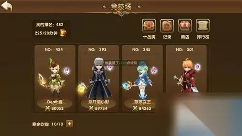 三、【竞技场】 竞技场系统也就是对战PK系统,玩家每天可以免费进行10次挑战,分为排位战和随机战。排位战就是挑战更高名次的玩家来提升自己的排名,毕竟排名越高奖励越高,随机战就是挑战当前排名附近的玩家,重在保障10次挑战胜利,而不是追求提升名次。竞技场胜利奖励有竞技场奖杯,可以在竞技场商店兑换英雄魂石和橙色卷轴碎片等玩家需要的道具。