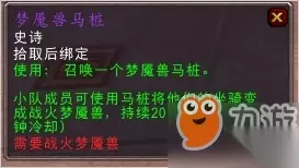 马桩的作用: 梦魇兽马桩能让你队伍中的成员召唤并驾驭一匹战火梦魇兽,最多持续20分钟。 更多的魔兽世界攻略: 魔兽世界战火梦魇兽怎么获得