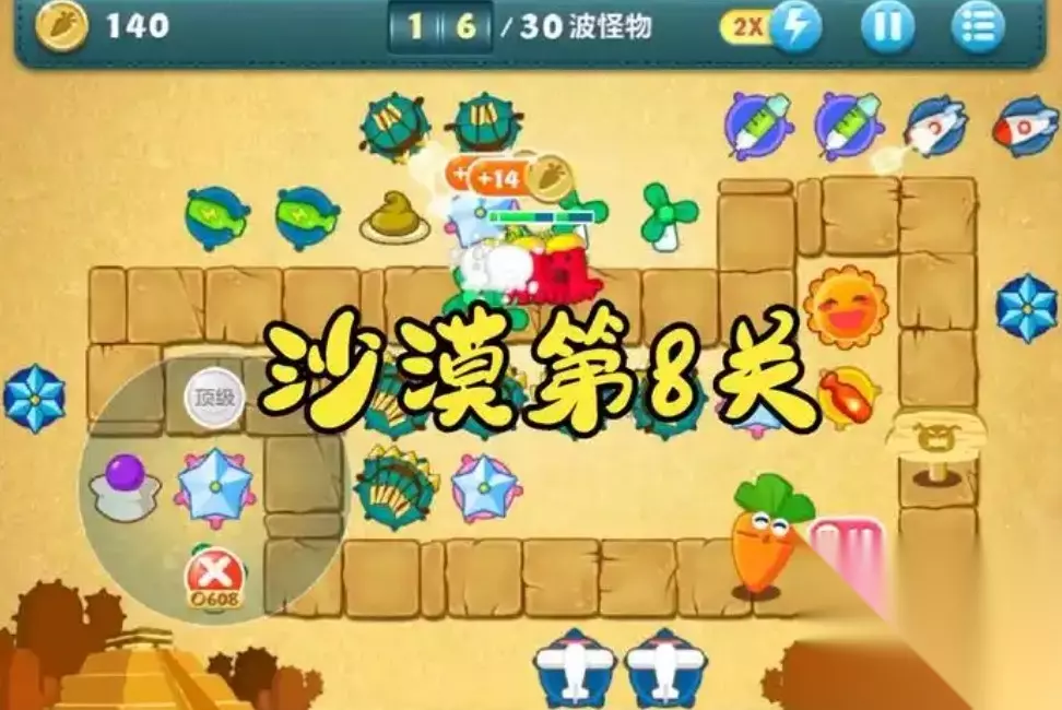 保卫萝卜沙漠第8关攻略 攻略二:开局建造:在中间建造一个风扇,锁住标记位置,先用20秒。之后在180秒的时候,释放第一个急速攻击,因为这时候,怪物数量上来了,继续锁住标记位置,开启冰锥之后,立马卖掉,升级风扇。攻略三:前期准备:开局放一个多重箭,攻击最边上的那个羊头,继续清理道具,优先把火箭升满阶。中期调节:继续清理道具,右边的雪花卖掉换为冷冻星星,左侧放个飞机开始清理左边道具。后期布局:全部道具清理完毕之后将不需要的全部卖掉,在中间放多重箭,有钱就在中间继续放多重箭。 攻略四:开局:在红色方框内建造1个太阳,而且升为顶级,运用太阳摧毁绿色方框里的障碍物,摧毁障碍物将会获得许多的炮塔。中期:把绿色方框里的炮塔全部出售,随后把剩下的火箭炮塔升为顶级,再在红色方框内再建造1个玩具飞机,最终升为顶级。后期:在红色方框内建造1个雪花炮塔,随后升为顶级,最后将绿色方框里的障碍物摧毁,得到2个多重箭后售卖,在红色方框内建造1个冷冻星星并升为顶级,再利用玩具飞机摧毁绿色方框里的障碍物,得到2个瓶子和1个雪花炮塔后,把绿色方框里的炮塔全部出售,在红色方框内各自建造1个雪花,在消灭第13波-18波怪时候,把2个雪花炮塔升为顶级,消灭第19波-21波怪后,在红色方框内建造2个玩具飞机,消灭第23波-29波怪后,把红色方框的2个玩具飞机升为顶级,最终迎来第30波怪BOSS。