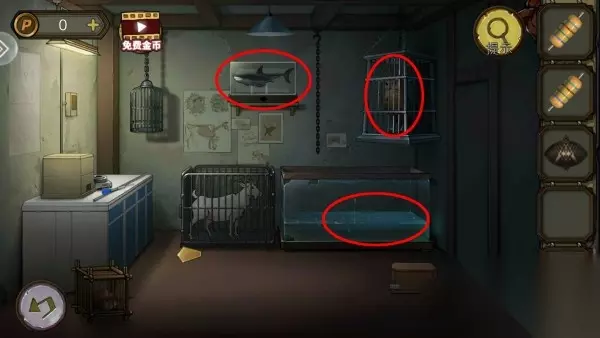 73、在发条装猫头鹰上,拿到瓣。金属片放鲨鱼箱子上,拿花瓣。