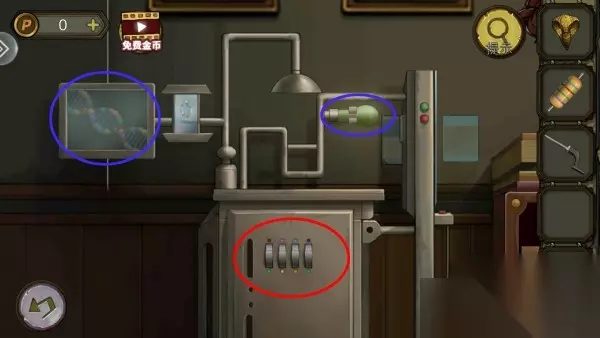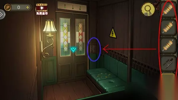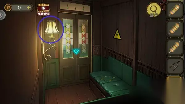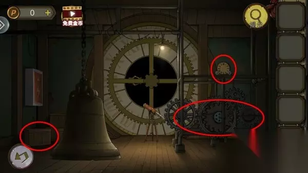 2、解开灯机关拿指针,指针装椅子机关上,根据柱子上线索解开,拿花铜卡和铁桶。