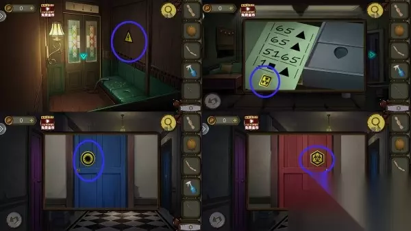 68、柜子机关解法:上半部资料,十字放左、闪电放右,交换资料位置,让线连起来。下半部药水,十字放上、闪电放下,按资料颜色摆放药水位置,如图所示。