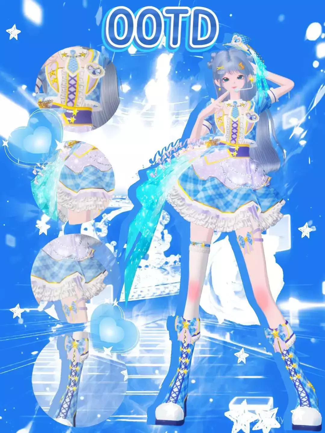 ➩服装整体以蓝、紫、白为主色调,带有星星等装饰元素。连衣裙有紫色系带和星星点缀,有蓝格纹,搭配白色蕾丝边,层次丰富;配饰有同色系帽子、发饰,还有蓝色飘带增添灵动感。蕾丝边是轻盈的纱质,增加柔美感;飘带类似有光泽的丝绸或合成纤维,呈现出闪烁效果;鞋子的材质看起来有皮革质感,搭配蝴蝶结和星星装饰,整体风格统一且充满梦幻甜美元素~