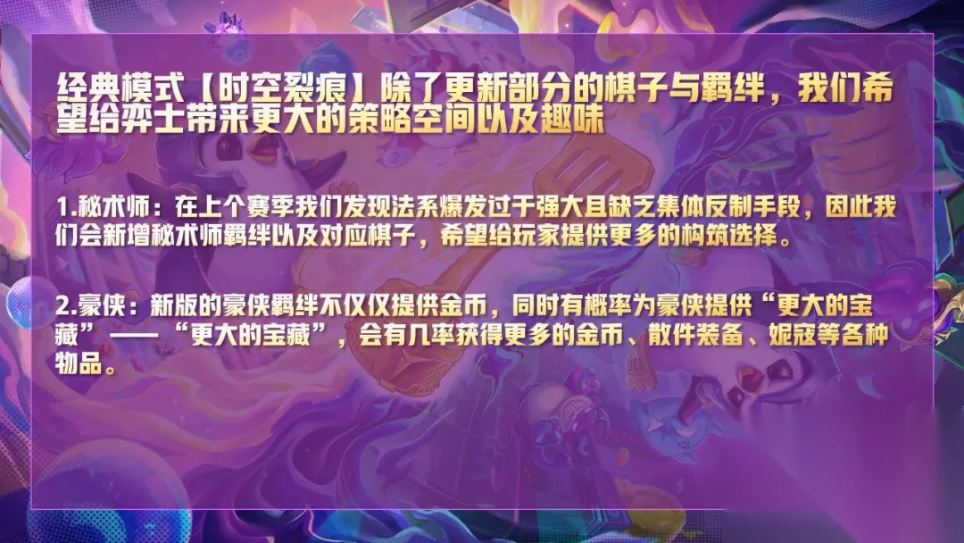 金铲铲之战的S1也将更新曾经没有的S1.5赛季,目前公布的有秘术师的加入和豪侠的大幅加强,你终于可以感受到曾经海盗带来的恐惧了!而且趣味性也不再固定,将于大大的增加,小编还是喜欢棋子的改动和替换能够再多一点,尤其是参照历史赛季增加一点变化的机制性,这会大大增加游戏的乐趣,S5比较缺乏乐趣的原因就是太固定,竞技性太单一了,其实S1也是这样的。 从排位更新的解释来看,有一个非常重要的关键点,就是S5将会保留匹配,这个和小编之前预料的一样,金铲铲之战未来可能会集齐S1到现在的所有的模式同时在线,这里官方的文字应该有错误,新赛季的排位应该是双城传说和时空裂痕。 新的赛季无论你之前是黄金还是王者,都会变成黑铁,不过隐藏分还是不一样的,一般来讲就是黄金以上段位的保留50%,虽然起始段位一样,但是上分的速度加减分不一样。