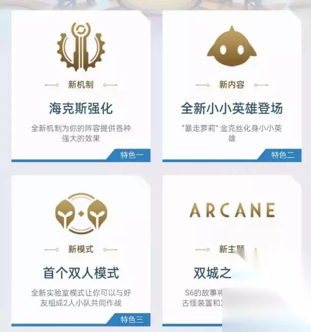 除了海克斯强化,云顶之弈还会有新的小小英雄登场,金克斯等新的英雄都会出现,金克斯太香了,一定要买,云顶之弈也会推出新的双人模式,增加新的竞技模式,暂不清楚后续是否会开放新的排位赛,让比赛更加有趣,双城之战大家看到发明家基本上就明白了,没错,欢迎来到祖安! S6极度好玩,极度值得期待!现在掌盟已经可以预约S6了,进入掌盟首页弹出的第一个页面就可以预约,可以领到一个S6小小英雄以及一个传说级小小英雄哦~还不快点去!