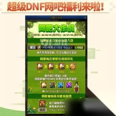 DNF网吧大作战活动 活动时间:20.06.05(维护后)~20.07.02(维护前) 活动内容: 在活动期间,拥有DNF特权网吧的玩家可以免费进入所有攻坚战(超时空漩涡,伊希斯攻坚战、再战安徒恩)。相对于上网费用来说,不需要门票仅仅是“蚊子腿”,肯定还有其他震撼内容。