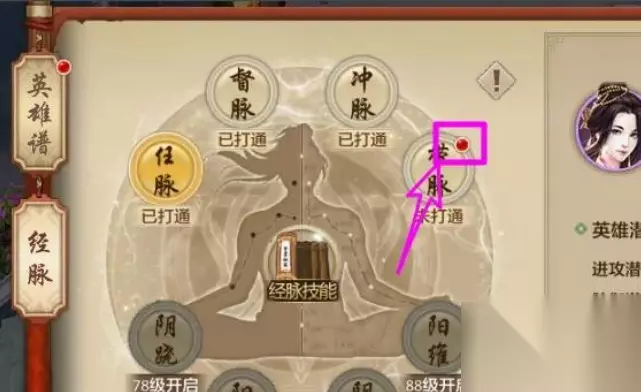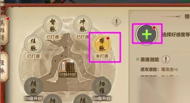 3、点击选中要打通的经脉 ,在右侧点【 】选择英雄,