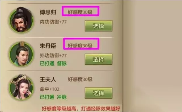 4、英雄必须好感度达到30级才可以用于打通经脉,