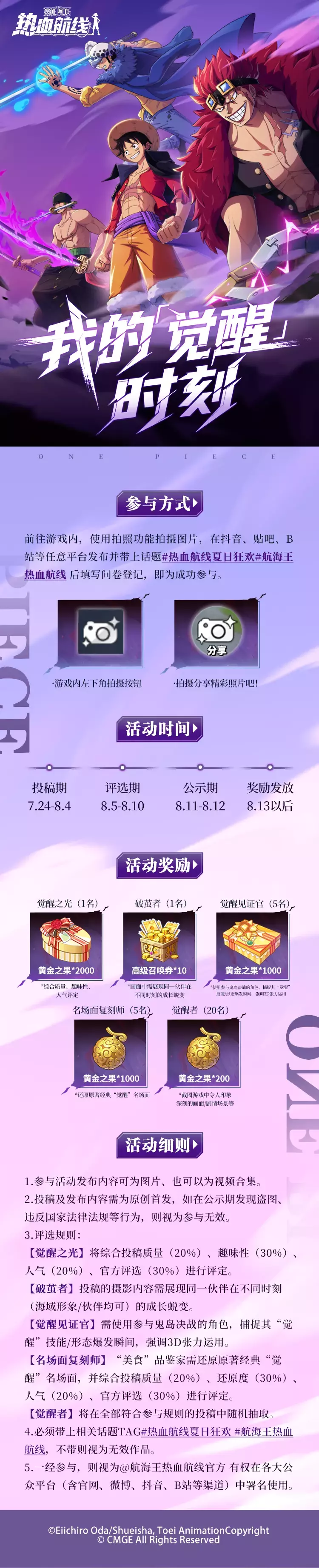 在这片承载着梦想与信念的伟大航路上,除了惊涛骇浪的挑战,更闪耀着一些一闪而过的“觉醒”瞬间!无论你是想化身【觉醒之光】用镜头捕捉最震撼的力量爆发,还是想成为【破茧者】定格战斗场上的张力时刻,或是作为【觉醒见证官】记录下伙伴成长的动人轨迹……这一次,你眼中的光芒就是最耀眼的航海勋章!