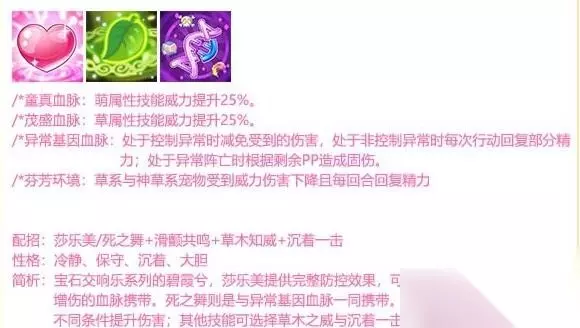 1. 技能配招:莎乐美/死之舞+滑颤共鸣+草木知威+沉着一击 2. 性格推荐:冷静、保守、沉着、大胆 3. 宝石交响乐系列的碧霞兮,莎乐美提供完整防控效果,可以配合童真与茂盛两个威力增伤的血脉携带。死之舞则是与异常基因血脉一同携带。 4. 滑颤共鸣在奇偶回合下根据不同条件提升伤害 5. 其他技能可选择草木之威与沉着一击,大概可以实战玩玩