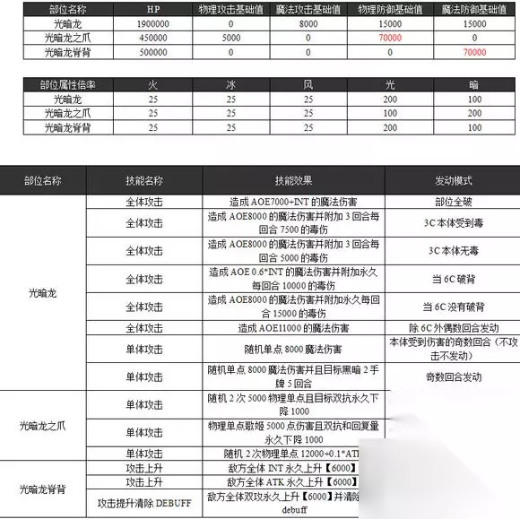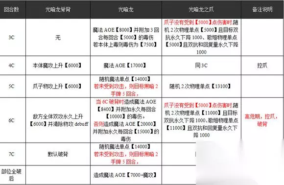 boss特性: 1.背7w魔防,暗属性;爪子7w物防,光属性。6c如果不破背会有高额aoe以及全体1w5的毒伤害,累计裸伤3w5基本救不回来。所以6c必须破背,非固定队不要尝试魔丘,强烈推荐物丘,6c不能破背就是死 2.爪子击破的越早越好,由于7w物防特性基本只能靠盗贼破爪子,同时每回合如果不对爪子造成5000伤害的话爪子会有第三下攻击,必定攻击歌姬而且会降回复量。所以盗贼不需要妨,要做的就是用暗刀炸爪子,保证除5C外打爪子5000伤害。 3.3c开始每回合都有毒伤害,防御压力很大,不要向贼要求妨了,她忙着控爪根本没有空间出妨。考验壕爸爸的时刻到了 4.双破后会狂暴,所以要注意留好光刀光chain尽快收尾