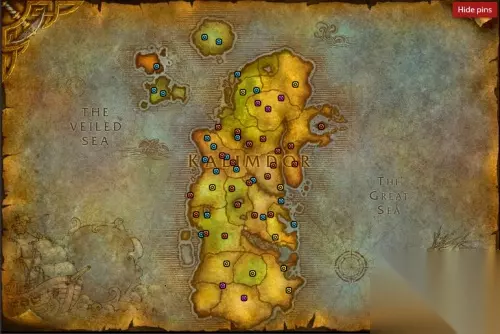 卡利姆多 黄色为共有的(9)、蓝色为联盟专属(19)、红色为部落专属(21)、紫色为大灾变版本共有的(5)