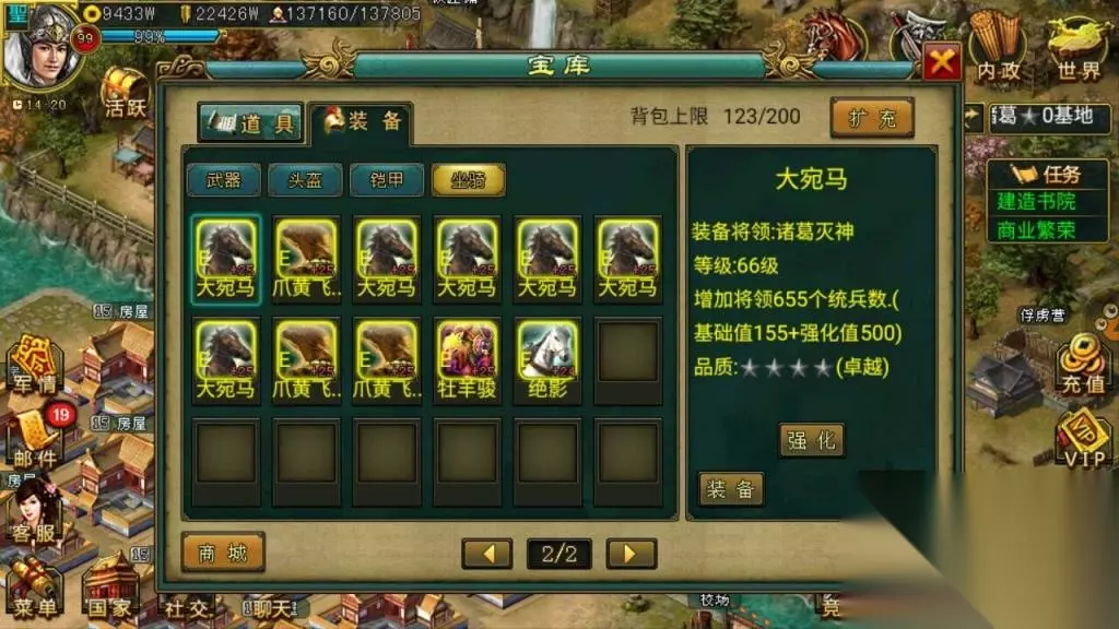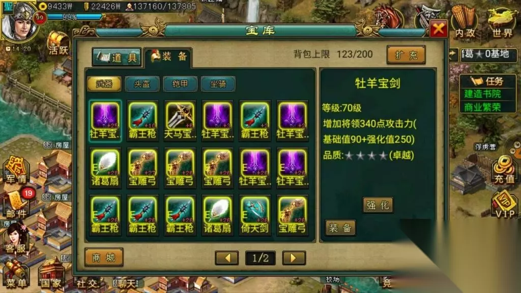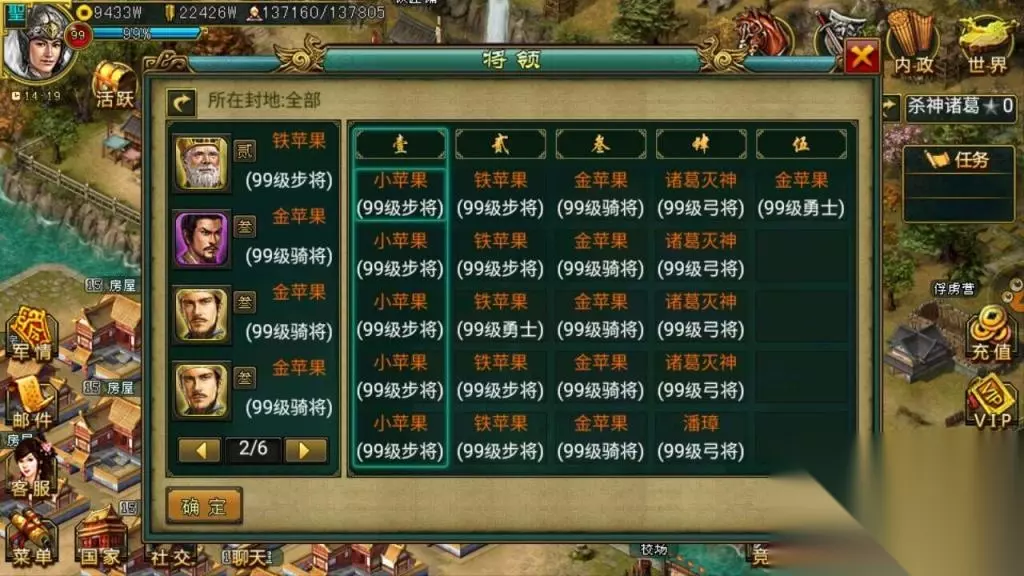 11.小白:关于推城,前期和后期,亲的兵种可有改变呢?为何如此呢 诸葛:推城前期都是用的近卫军加强弩手,因为,成本低,防御高输出高,唯一的缺陷就是行动慢。后期的话,基本全是骁骑配合弩骑了,行动快,全骁更快,更有效率 12.小白:亲的君王将如此之多,是如何得来的呢? 诸葛:全是冲值得的,我自己有很多号,基本每次出活动都会冲2到3个,有时候甚至4个,不过有时候也会一个都不冲,关键看是什么将,后期从别人那里也收了几只。