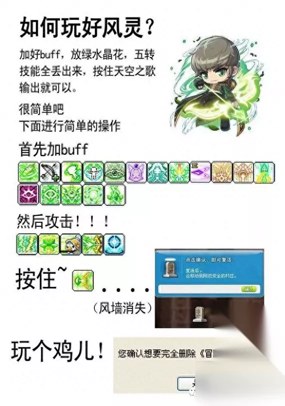 6、攻击BOSS! 常规如果想挑战到进阶(贝伦、女王、半半、小丑)以及斯乌、黛米安的话,面板上90无视就足够了。加满buff后,先丢束缚击: 常规输出天空之歌,攻击BOSS时释放懒虫、呼啸暴风(该技能也是主要输出技能,段数攻击很高)。同时释放冒险骑士团方阵: 风灵在对抗斯乌的时候,可以灵活运用风影漫步(一个非常好的位移技能,一直多按该技能可以使得一段时间一直悬空,但触碰到地图最左或最右的时候会掉落下来): 可以在斯乌2,3阶段释放地下电流的情况下通过该技能躲避伤害。 另外,针对秒杀技能,风墙也提供了一个小无敌: 玩家在预判会被秒杀的情况下,提早释放风墙可以避免被秒杀。 针对部分BOSS,风灵提供了一个小减速技能(绿水晶花): 该技能打贝勒德的时候非常好用,放一边当做替身让贝勒德攻击他,自己另外一边输出,很舒服。 清理BOSS小怪则可以使用季候风来处理: 按照惯例,来一张如何玩好风行: