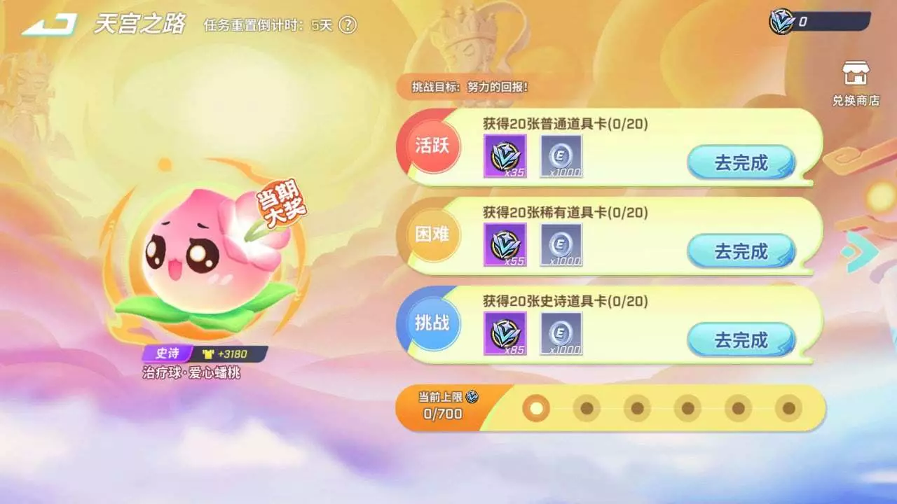 本次可以通过活跃任务减负,注意很简单就可以获得史诗品质的,治疗球爱心蟠桃,请少年少年务必拿下。