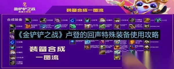 《金铲铲之战》手游中卢登的回声可以对目标造成180点魔法伤害,同时对目标附近3格单位造成180魔法伤害,是非常厉害的一件装备,很多新手玩家对这个装备不是很熟悉,不清楚装备的怎么用,属性怎么样,和什么样的英雄搭配最合适,小编这里整理了《金铲铲之战》卢登的回声特殊装备使用攻略,希望对小伙伴们有所帮助,感兴趣的小伙伴可以点击浏览哦。 《金铲铲之战》装备合成攻略汇总