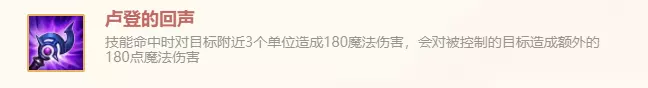 卢登的回声装备使用效果 技能命中时对目标附近3格单位造成180 魔法伤害,会对被控制的目标造成额外的180点魔法伤害。 卢登的回声装备使用解析 当持有者对目标形成技能伤害的时候,周围最多三个敌人将在第一次命中时受到150/175/225的魔法伤害。 该伤害会随持有者的等级增长,并且会在每次释放技能的时候都会触发一次这个效果。