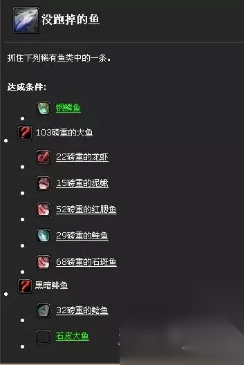 首先,完成没跑掉的鱼我们需要330点钓鱼点数,如果没有这么多的点数,我们在指定地方是钓不上来没跑掉的鱼成就所需的鱼的! 此外,由于大地裂变版本的原因,许多区域地形发生了变化,因此,部分鱼的钓取地点会稍有变化,但影响不会太大。 接下来,我也为大家介绍没跑掉的鱼成就所需的鱼的区域,如果大家钓鱼点数足够,那就前往那些地方,一个一个完成吧! 钢鳞鱼 这是一件单手武器装备,属性也算不错,可以留作纪念! 钓取地点:灰谷、湿地、希尔布莱德丘陵旁的海岸有几率掉出。 钓取这个鱼需要至少55点钓鱼点数。 103磅重的大鱼 钓取地点:艾萨拉海岸线附近掉出,但几率较低,也有玩家在奥格瑞玛城中钓出。 钓取这条鱼需要至少330点钓鱼点数。 22磅重的龙虾 钓取地点:艾萨拉海岸线附近掉出,但几率较低。 钓取这条鱼需要至少330点钓鱼点数。 15磅重的泥鳅 钓取地点:秘蓝岛(埃门谷湖泊附近)、丹莫罗、杜隆塔尔、艾尔文森林、永歌森林(地图外的小岛上)、莫高雷、泰达希尔、提瑞斯法林地。 钓取这条鱼需要至少1点钓鱼点数。 52磅重的红腮鱼 钓取地点:艾萨拉、费伍德森林、菲拉斯、辛特兰、玛拉顿、月光林地、阿塔哈卡神庙、安戈洛环形山、西瘟疫之地。 钓取这条鱼需要至少205点钓鱼点数。 29磅重的鲑鱼 钓取地点:燃烧平原、东瘟疫之地、菲拉斯、希利苏斯、斯坦索姆、冬泉谷。 钓取这条鱼至少需要330点钓鱼点数。 68磅重的石斑鱼 钓取地点:艾萨拉、菲拉丝、辛特兰、荆棘谷、塔纳利斯。 钓取这条鱼至少需要205点钓鱼点数。 32磅重的鲶鱼 钓取地点:贫瘠之地、哀嚎洞穴、黑暗深渊、银松森林、秘血岛、死亡矿井、幽魂之地、西部荒野、黑海岸、洛克莫丹、灰谷、暮色森林、希尔斯布莱德丘陵、赤脊山、石爪山脉、湿地、奥特兰克山脉、阿拉西高地、凄凉之地、尘泥沼泽、荆棘谷、悲伤沼泽、千针石林 钓取这条鱼需要至少1点钓鱼点数。 黑暗鲱鱼 钓取地点:嚎风峡湾 钓取这条鱼至少需要425点钓鱼点数。 石皮大鱼 钓取方式:荆棘谷钓鱼大赛中可口鱼鱼群中可以钓到。 钓取这条鱼至少需要1点钓鱼点数。 以上就是成就没跑掉的鱼所需钓鱼地点一览。