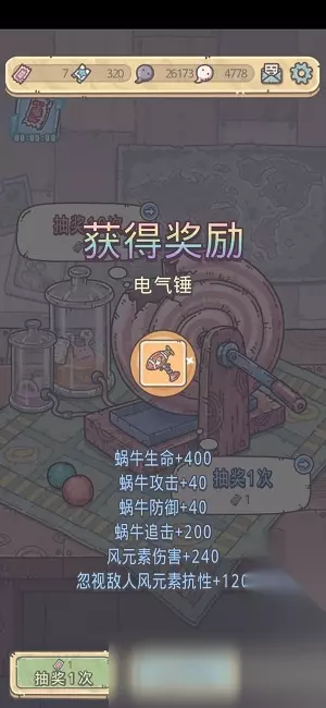 《最强蜗牛》里的电气锤是强力前期武器,可助玩家通关,玩家主要能通过密令抽取(几率低,看运气)、参与对应游戏活动这两种方式获取该装备。