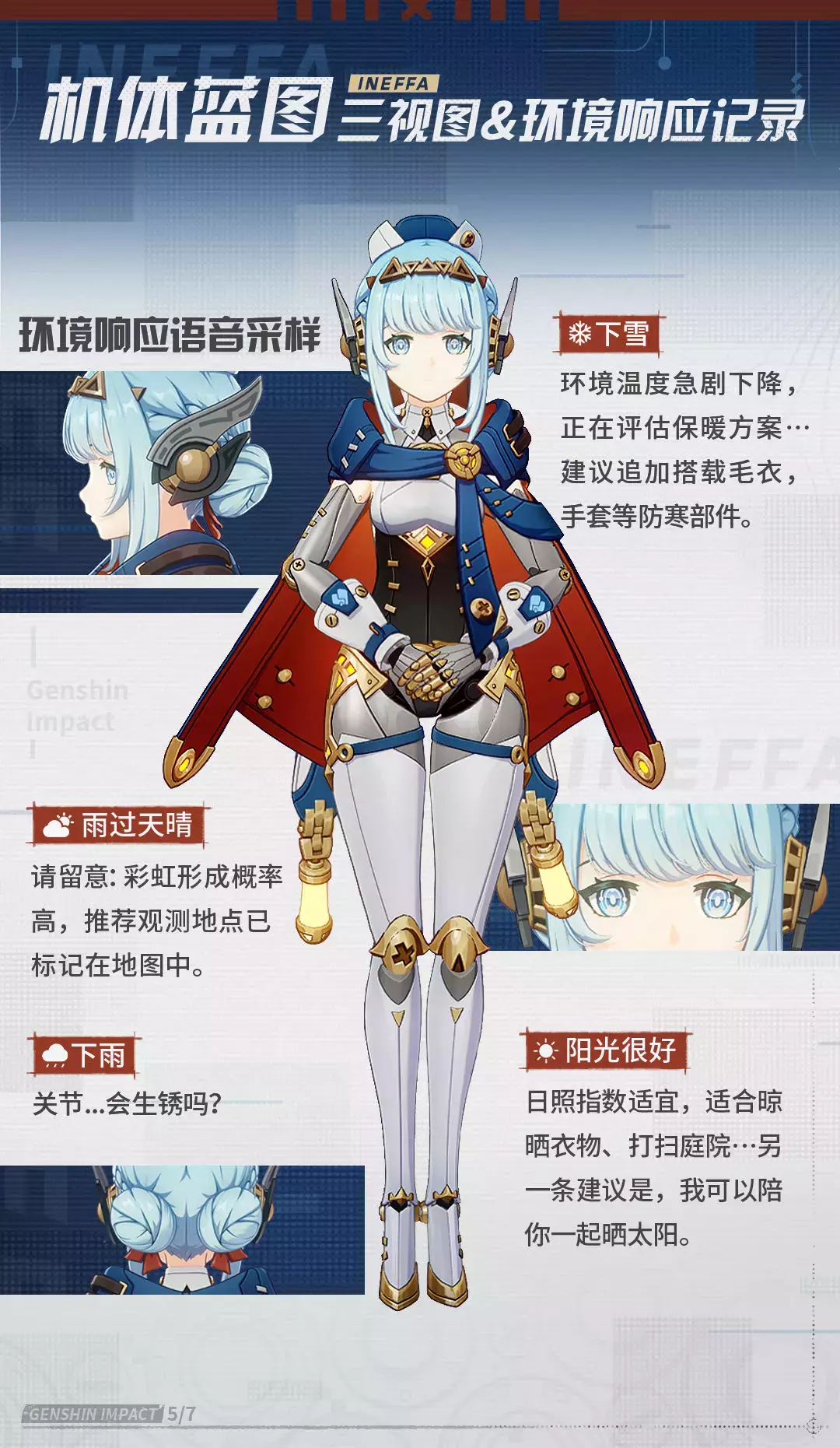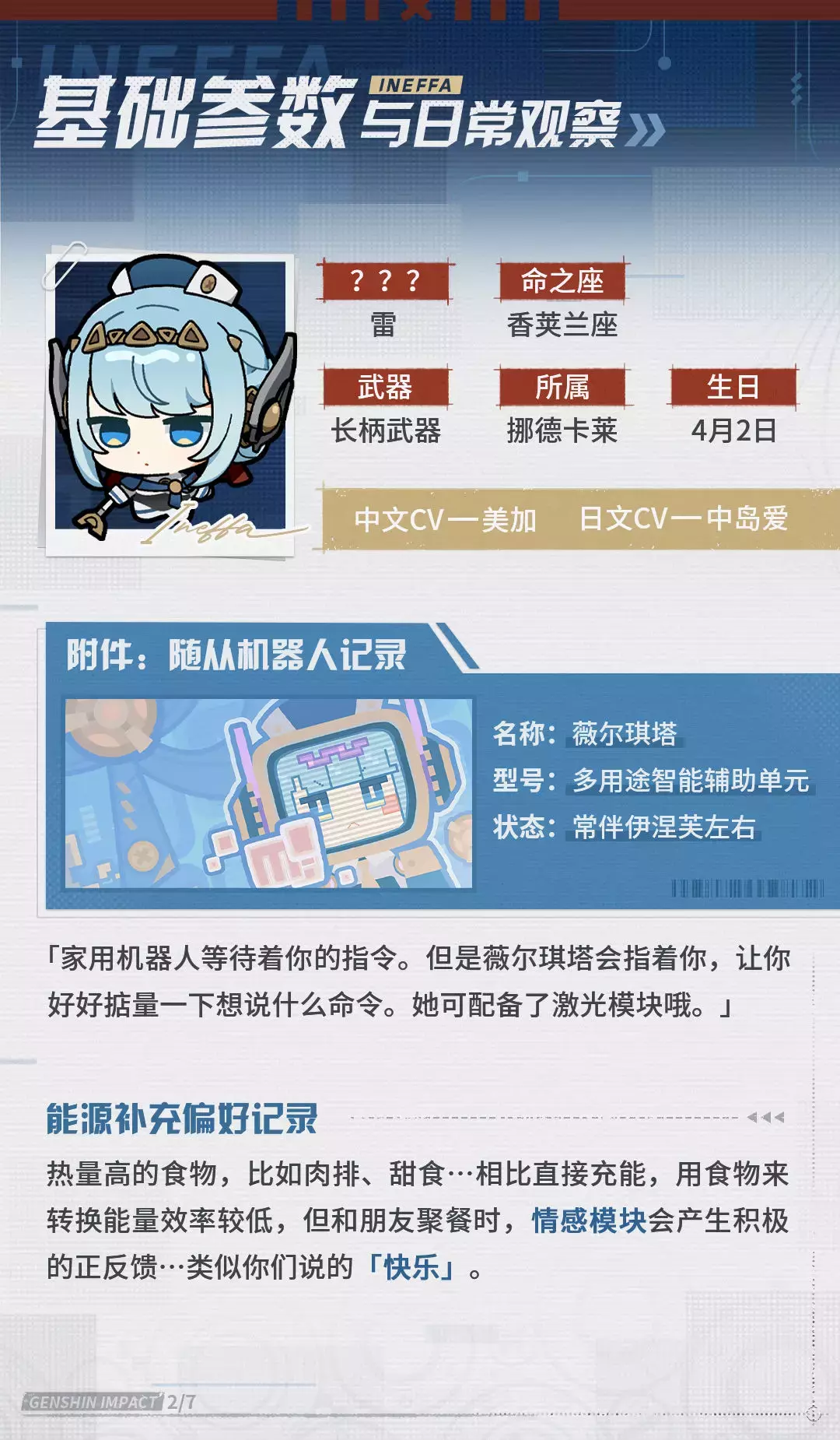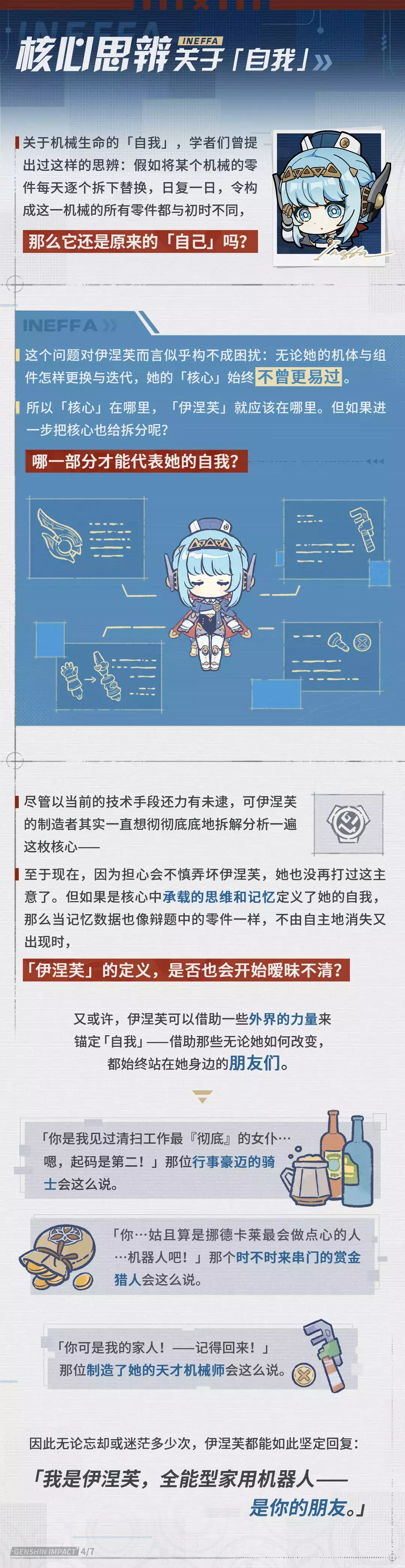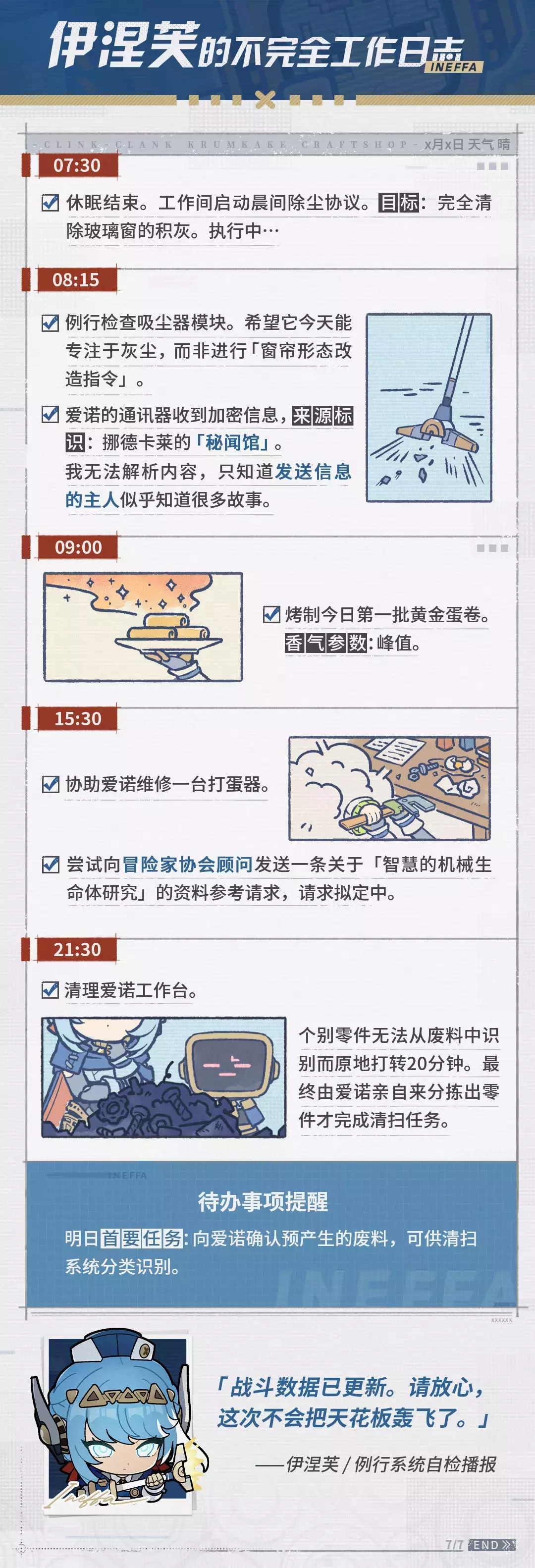 纸张摊开着,字迹与涂鸦隐约可见, 像是记录着一位名为「伊涅芙」的构造与日常...