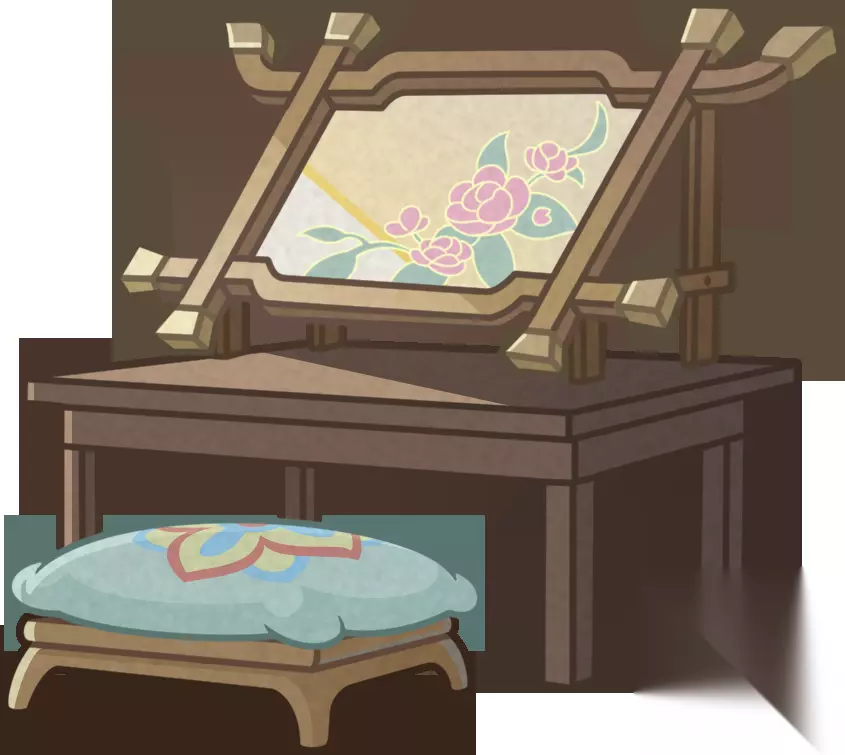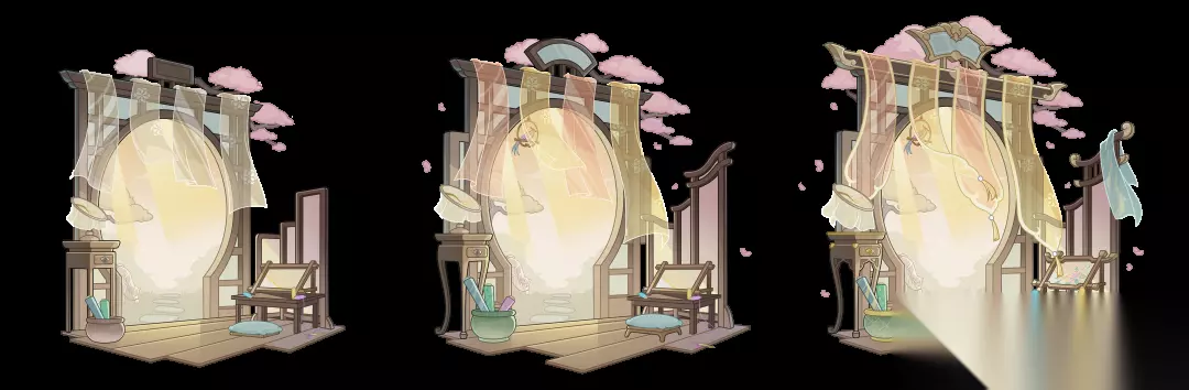 背景设计上,中御府的地面光洁如新,背后的月洞门外天光正好,门框上悬挂的条流苏帷幔随风飘动,与空中飘散的淡粉花瓣,交织成这威严宫廷的一部分。庄重典雅的红木绣架注视着这穿针引线的时刻,期待着图多盖洛呈上绝世珍品时的惊艳。
