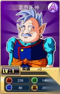 北界王神 A卡人物 人物介绍:和其他的界王神一样,他也是一个快乐的神。他是第二个被魔人布欧杀害的界王神,尽管他成功地用剑将布欧斩成了两半。 天赋武功:闪光炮 初始属性: 攻击149、防御86、血量238、元气 286 属性成长: 攻击 7、防御 4.5、血量 8.24、元气 11.5 缘份: 五神:与大界王神齐上阵,攻击提升25% 德高望重:与武泰斗齐上阵,元气提升25% 众矢之的:与巴比迪王齐上阵,血量提升21% 北界:与北界齐上阵,防御提升28% 界王神剑:装备界王神剑,攻击提升25% 爆力魔波:装备爆力魔波,元气提升21%