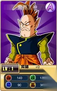南界王神 A卡人物 人物介绍:动漫《龙珠Z》中出场的人物,是”东、南、西、北“界王神中最强大最善于战斗的神,但最终在战斗中被魔人布欧吸收。 天赋武功:伽力克大炮 初始属性: 攻击 130、防御90、血量140、元气 380 属性成长: 攻击 7.1、防御 4.8、血量 7、元气 11.5 缘份: 五神:与西界王神齐上阵,血量提升28% 联手对敌:与库林齐上阵,防御提升18% 神与神:与天神齐上阵,血量提升20% 南界:与南界王齐上阵,血量提升28% 死亡光环:装备死亡光环,血量提升26% 魔族克星:装备魔封波,攻击提升25%