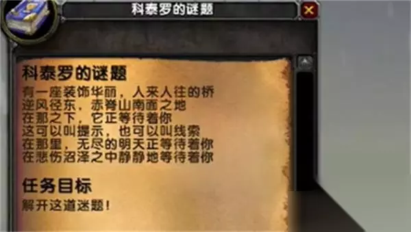 魔兽世界科泰罗的谜题去哪里接 答:荆棘谷 1. 首先,需要前往沉默海湾上大船最底层的货舱,那里有几率刷新出这个谜题。完成谜题后,将获得一个拥有十四个格子的背包作为奖励。