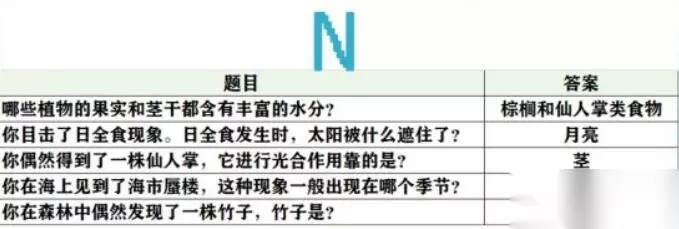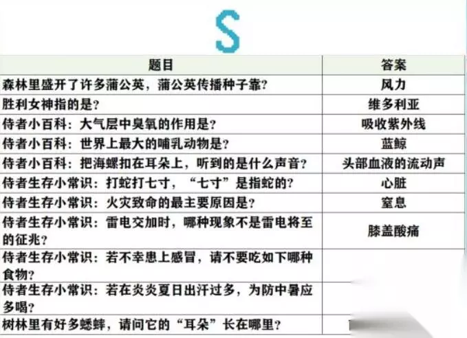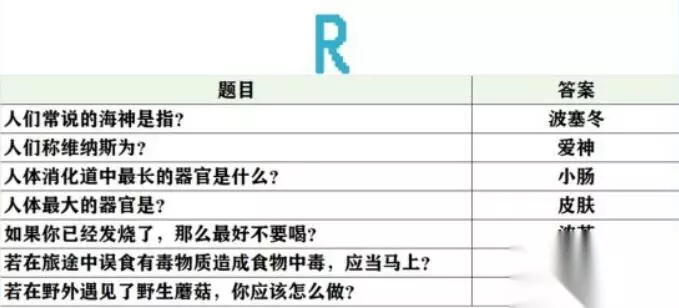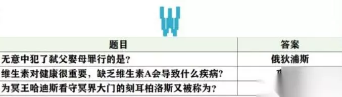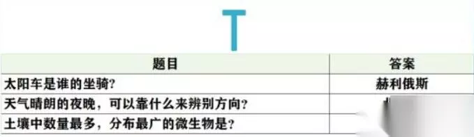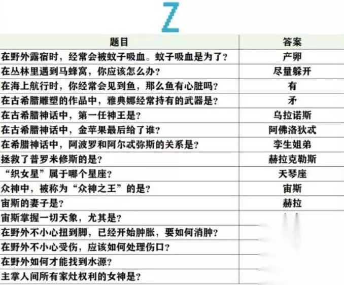 未定事件簿女神的试炼问题答案大全 1、阿尔式弥斯的圣兽是? 梅花鹿 2、奥林匹斯山的贼神,偷吃的第一顿美餐是? 阿波罗的两头牛 3、被恶鹰啄食肝脏的是? 普罗米修斯 4、波塞冬的武器是? 三叉戟 5、柏拉图以对话的形式创作的哲学著作是? 《理想国》 6、不会游泳的人在死海里会? 浮在水面上 7、成功获取金羊毛的是? 伊阿宋 8、传说中,特洛伊战争的起因是? 不和的金苹果 9、狄俄尼索斯是古希腊神话中的酒神,他所代表的酒是? 葡萄酒 10、法厄同向父亲赫利俄斯要的生日礼物是? 驾驶太阳马车 11、贵族少女间最近在研制香料,从抹香鲸体内提炼处的香料是? 龙诞香 12、故事的伊始,口吐黑气污染了诸神的是? 提丰 13、古希腊传说中,发明了尺,数字和字母的是? 赫尔墨斯 14、古希腊雕刻家米隆取材于体育竞技而创作的艺术品是? 掷铁饼者 15、古希腊地区的典型气候是? 地中海气候 16、古希腊神话中,被称为不和女神的是? 厄里斯 17、古希腊神话中象征着财富、冒险和不屈不挠意志的珍宝是? 金羊毛 18、古希腊文学史上最早的正式的书面文学作品是? 荷马史诗 19、海岸边发生了潮汐现象,这种现象是由什么引起的? 地月吸引力 20、海洋中最多的生物是? 浮游生物 21、将军夫人动告将军不要多饮酒,因为饮酒会伤害以下哪个器 心脏 22、络边偶遇的一个小孩子问了你一个问题:一公斤铁和一公斤棉花哪一个重? 一样重 23、洛边有很多小孩在观察“蜻蜓点水”。“蜻蜓点水”的原因是? 产卵 24、露营过夜,你会选择在哪里扎营? 靠近水源的高处 25、旅途中感到口渴,你应该用什么方式喝水? 小口慢慢喝 26、旅行途中饥饿,看到小溪里有鱼,可以用什么东西制作通钩? 缝衣针 27、旅行的途中,大多数的人称呼你为? 侍者 28、旅行的途中,你常常会看到月光,“月光”是? 月亮反射太阳光 29、旅行的途中,你偶尔会得到大地之母的指引。“大地之母”指? 盖娅 30、旅行时,若被蚂鳞叮在身上,可以? 手指弹击钻入处皮肤 31、行途中遇到的宝箱,它来自? 祭司团 32、哪些植物的果实和茎干都含有丰富的水分? 棕相和仙人掌类食物 23、目击了日全食现象。日全食发生时,太阳被什么遮住了? 月亮 24、偶然得到了一株仙人掌,它进行光合作用靠的是? 茎 25、在海上见到了海市蜃楼,这种现象一般出现在哪个季节? 夏天 26、在森林中偶然发现了一株竹子,竹子是? 草 27、香多拉的魔盒中深藏的一件美好中物是? 希望 28、罗米修斯送给人类的礼物是? 火29、丘比特是谁的儿子? 维纳斯 30、人们常说的海神是指? 波塞冬 31、人们称维纳斯为? 爱神 32、人体消化道中最长的器官是什么? 小肠 33、人体最大的器官是? 皮肤 34、如果你已经发烧了,那么最好不要喝? 浓茶 35、若在旅途中误食有毒物质造成食物中毒,应当马上? 催吐 36、若在野外遇见了野生蘑菇,你应该怎么做? 不采摘也不食用 37、森林里盛开了许多蒲公英,蒲公英传播种子靠? 风力 38、胜利女神指的是? 维多利亚 39、侍者小百科:大气层中臭氧的作用是? 吸收紫外线 40、侍者小百科:世界上最大的哺乳动物是? 蓝鲸 41、侍者小百科:把海螺扣在耳朵上,听到的是什么声音? 头部血液的流动声 42、侍者生存小常识:打蛇打七寸,“七寸”是指蛇的? 心脏 43、侍者生存小常识:火灾致命的最主要原因是? 室息 44、侍者生存小常识:雷电交加时,哪种现象不是雷电将至的征兆? 膝盖酸痛 45、侍者生存小常识:若不幸患上感冒,请不要吃如下哪种食物? 海鱼 46、侍者生存小常识:若在炎炎夏日出汗过多,为防中暑应多喝? 盐开水 47、树林里有好多蟋蟀,请问它的“耳朵”长在哪里? 前足的小腿节上 48、太阳车是谁的坐骑? 赫利俄斯 49、天气晴朗的夜晚,可以靠什么来辨别方向? 北极星 50、土壤中数量最多,分布最广的微生物是? 细菌 51、无意中犯了弑父娶母罪行的是? 俄狄浦斯 52、维生素对健康很重要,缺乏维生素A会导致什么疾病? 夜言症 53、为冥王哈迪斯看守冥界大门的刻耳柏洛斯又被称为? 地狱三头犬 54、下面哪一位是古希腊的哲学家? 柏拉图 55、想去除手上的鱼腥味,可以用? 牙音 56、希腊的众多城邦中,最具影响力的是? 雅典 57、希腊神话中的月亮女神是? 可尔式弥斯 58、想要通过饮食补充铁,可以吃? 动物肝脏 59、雅典娜除了被称作智慧女神外,还被称作? 战争女神 60、眼睛具有石化魔力的蛇发女妖是? 美杜莎 61、野外露营时,以下哪个地方不适合被选为营地? 悬崖下 62、夜晚睡觉,旁边的小孩一直磨牙,很可能是什么原因? 可能有肠道疾病 63、伊阿宋驾驭的是? 神牛 64、因宙斯爱慕,被变成牛后依然被赫拉追杀的是? 伊娥 65、以下哪位被称为“战神”? 阿瑞斯 66、引发特洛伊战争的美女是? 海伦 67、雨后,天边出现了彩虹,这道彩虹顶部的颜色是? 红 68、月桂树是由哪一位美丽仙女变成的? 达芙妮 69、在野外露宿时,经常会被蚊子吸血。蚊子吸血是为了? 产卵 70、在丛林里遇到马蜂窝,你应该怎么办? 尽量躲开 71、在海上航行时,你经常会见到鱼,那么鱼有心脏吗? 有 82、在古希腊雕塑的作品中,雅典娜经常持有的武器是? 矛 73、在古希腊神话中,第一任神王是? 乌拉诺斯 74、在古希腊神话中,金苹果最后给了谁? 阿佛洛狄忒 75、在希腊神话中,阿波罗和阿尔忒弥斯的关系是? 孪生姐弟 76、拯救了普罗米修斯的是? 赫拉克勒斯 77、“织女星”属于哪个星座? 天琴座 7