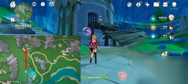 此外,任务完成后大家可以来到高塔最底层。储能装置③号已经自己回来了,我们拾取它,把它放到旁边的终端处,打开大门。 门开后会出现一个摩拉盒。往外走有个挑战,如果还没做可以一并做了。