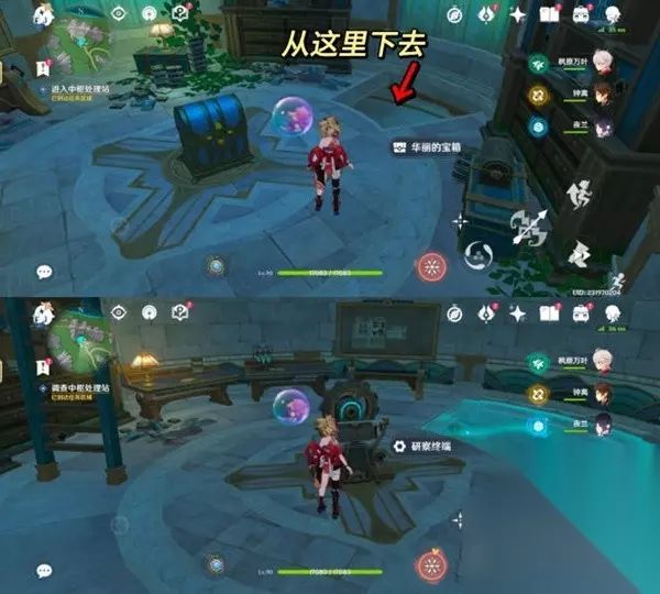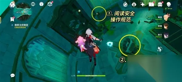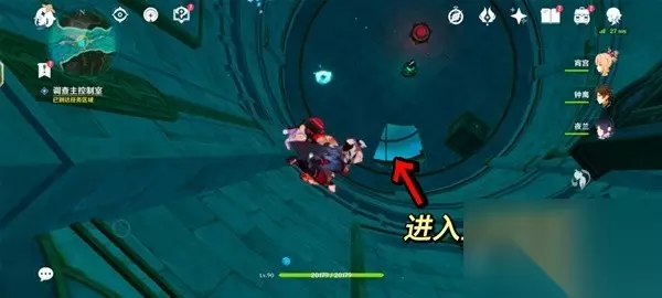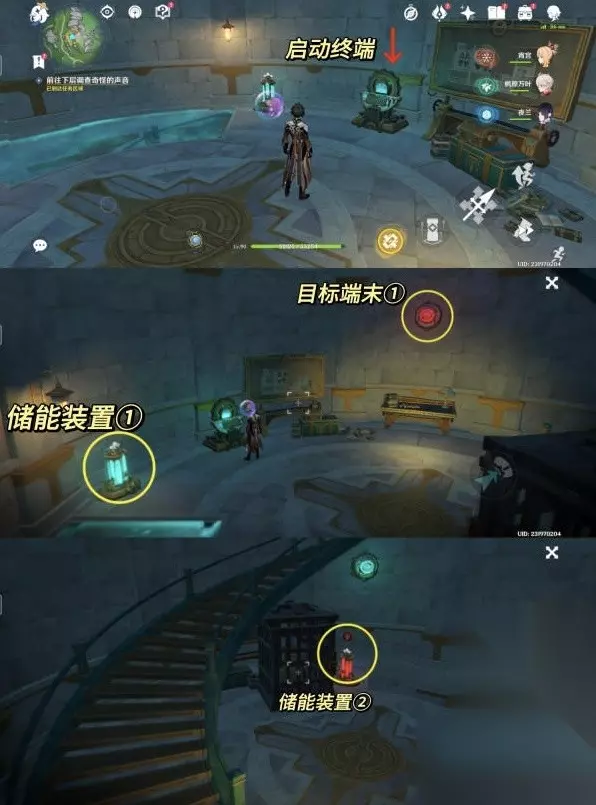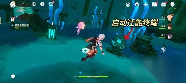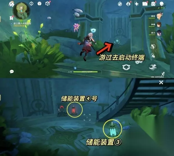 4.追上愚人众指挥官 沿着旁边的楼梯往下一层。然后启动房间中间的迁能终端,进入迁能端末视野。 对准储能装置①号,点击吸收能量。把能量迁移到储能装置②号处。然后退出视野。